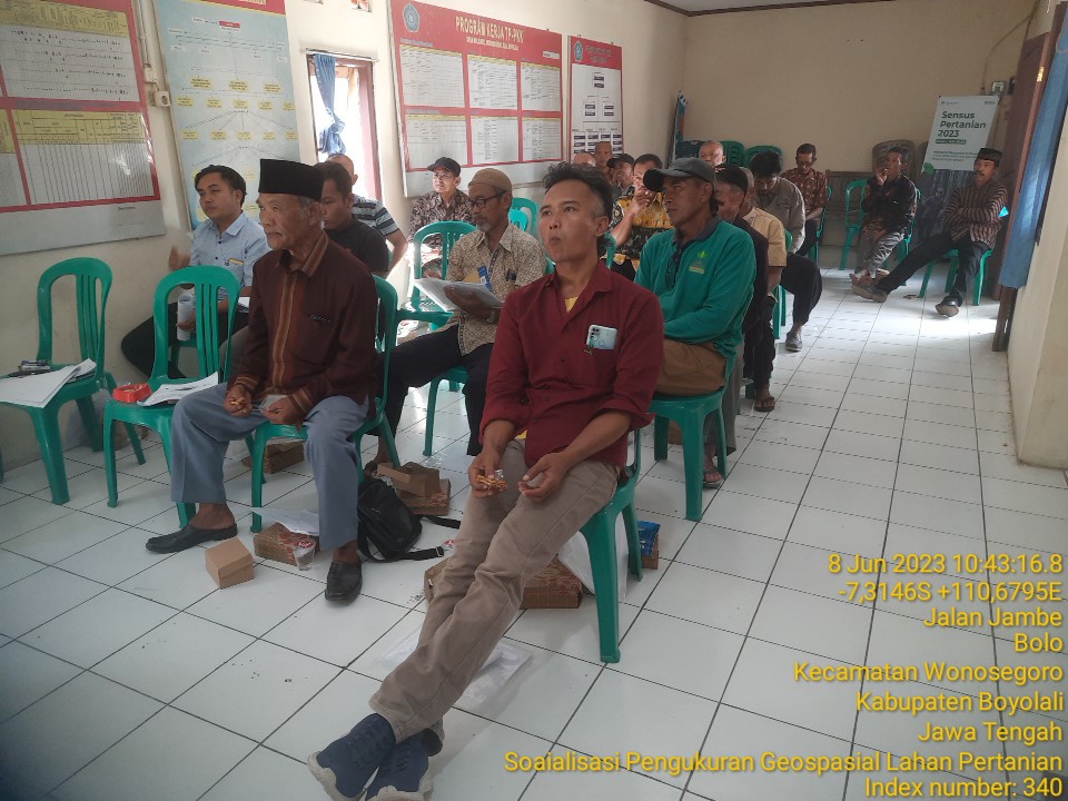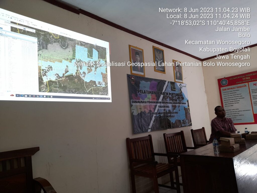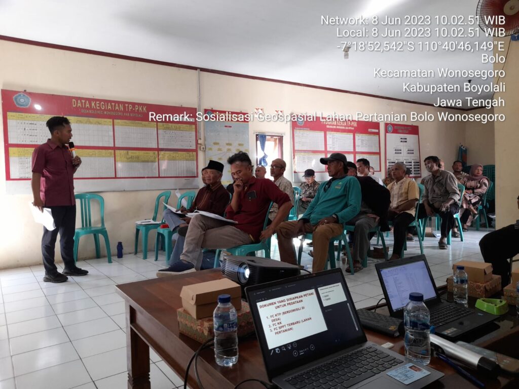 BOYOLALI  – Kali ini BPP Kecamatan Wonosegoro melaksanakan fungsinya sebagai Pusat Informasi dengan melaksanakan Sosialisasi Pengukuran Geospasial Lahan Pertanian. Kegiatan ini dibiayai dari Dana Alokasi Khusus Non Fisik Tahun Anggaran 2023 melalui mekanisme APBD Kabupaten Boyolali, yang dilaksanakan secara swakelola oleh kelompok tani Tani Makmur Desa Bolo Kecamatan Wonosegoro. Data Geospasial adalah data tentang lokasi geografis, dimensi atau ukuran, dan/atau karakteristik obyek alam dan/atau buatan manusia yang berada di bawah, pada, atau di atas permukaan bumi.