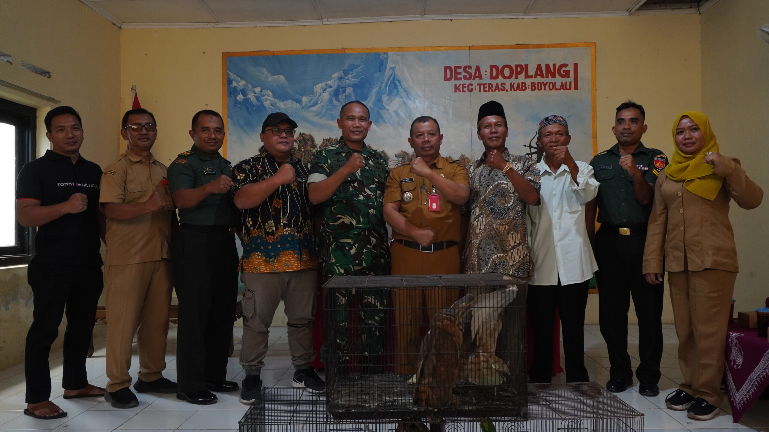 Teras, 21 Juli 2025. Dalam rangka mengantisipasi serangan tikus yang banyak menyerang persawahan di Kecamatan Teras, pada hari Senin, 21 Juli 2025, Kodim 0724 Boyolali yang diwakili Danramil Teras menyerahkan bantuan berupa lima pasang Burung Hantu jenis Serak Jawa (Tito alba) kepada Dinas Pertanian Kabupaten Boyolali. Selanjutnya burung hantu tersebut diserahkan kepada Gapoktan Tani Maju Desa Doplang dan Gapoktan Manunggal Desa Nepen untuk dimanfaatkan sebagai pengendali hama tikus di lokasi persawahannya. Dalam kesempatan tersebut, Plt. Kepala Dinas Pertanian Kabupaten Boyolali, Suyanta, SP. MM, menyampaikan apresiasinya kepada Kodim 0724 yang telah mendukung pengendalian hama tikus melalui penyerahan Burung Hantu. Burung Hantu tersebut menjadi salah satu solusi pengendalian hama tikus di Desa Nepan dan Desa Doplang. Senada dengan hal tersebut, Danramil Teras menyebutkan bahwa penyerahan Burung Hantu merupakan salah satu bentuk dukungan TNI dalam mensukseskan program ketahanan pangan di Kabupaten Boyolali.
