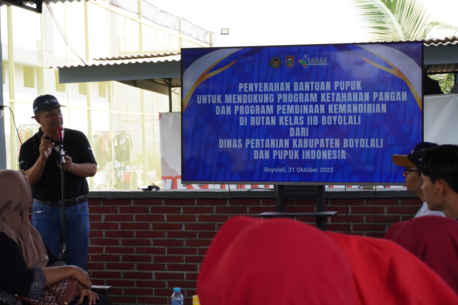 Suyanta, SP., M.M, Kepala Dinas Pertanian Kabupaten Boyolali, dalam sambutannya menyampaikan bahwa bantuan ini merupakan supporting Dinas Pertanian Kabupaten Boyolali sebagai kepanjangan tangan Bupati Boyolali dalam rangka partisipasi mendukung kegiatan ketahanan pangan yang ada di Rutan kelas IIB Boyolali. Harapannya, warga binaan yang telah lulus, mempunyai skill dan keterampilan sehingga bisa kembali ke masyarakat dengan baik. Akbral Febri Handrian. Str. Pas, selaku Kasubsi Pelayanan Tahanan Rutan kelas IIB Boyolali menyampaikan terima kasih kepada Dinas Pertanian dan Pupuk Indonesia atas sumbangan pupuk dalam rangka mendukung ketahanan pangan di Rutan kelas IIB Boyolali. Semoga ke depannya bisa terus bersinergi untuk mewujudkan lembaga pemasyarakatan yang bermanfaat untuk masyarakat.